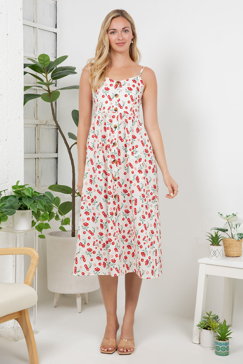 Embrace vibrant style with this cherry print dress, featuring delicate adjustable straps that offer comfortable all-day wear. The playful cherry motif brings a fresh, feminine touch perfect for casual outings or weekend adventures. Lightweight and versatile, this dress transitions effortlessly from day to night. A wardrobe essential that combines bold print appeal with practical comfort.