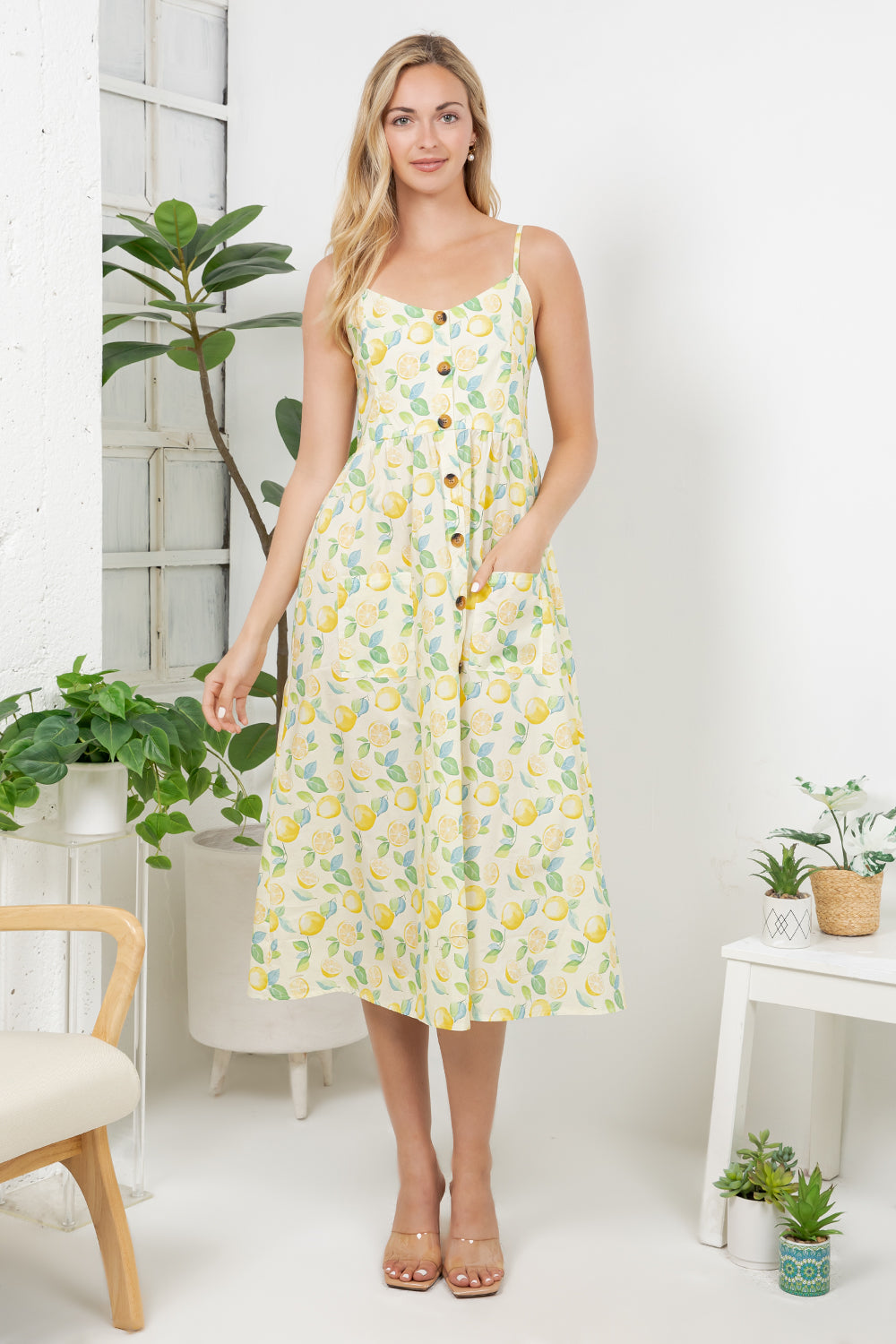 Zesty and refreshing, this lemon print cami dress brings citrus-inspired charm to your closet. The cheerful lemon motif adds a pop of color and personality to the simple, streamlined cami silhouette. Crafted from breathable fabric, it's designed for comfort during warm days and pairs beautifully with minimal accessories. A light, breezy essential that feels effortlessly chic.