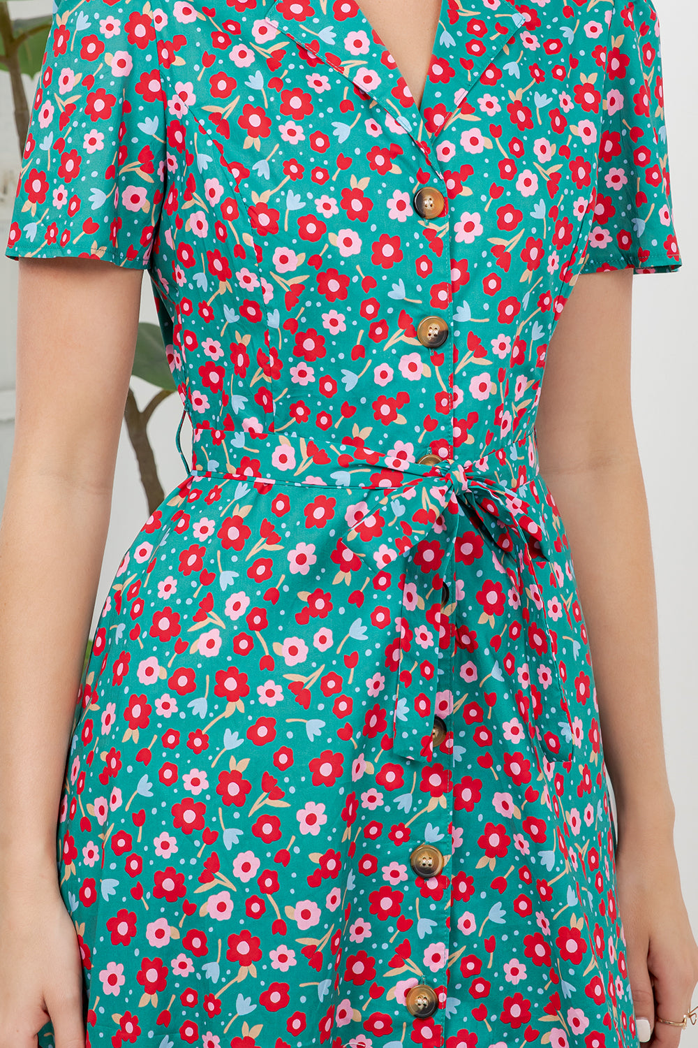 Vibrant florals bring energy to this retro shirt dress with vintage appeal. The structured waist tie creates a polished silhouette while practical pockets add everyday functionality. Button it up for a crisp, put-together look or wear it relaxed for effortless style.