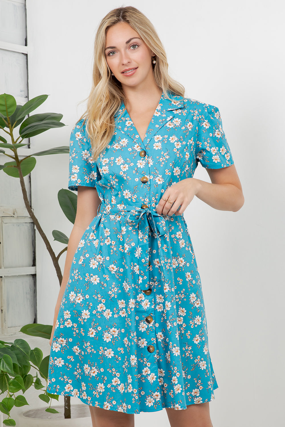 Delicate daisies bloom across this charming retro shirt dress with feminine puff sleeves. The waist tie defines your shape while functional pockets keep your essentials close. A garden-fresh piece that captures vintage elegance with modern comfort and practicality.
