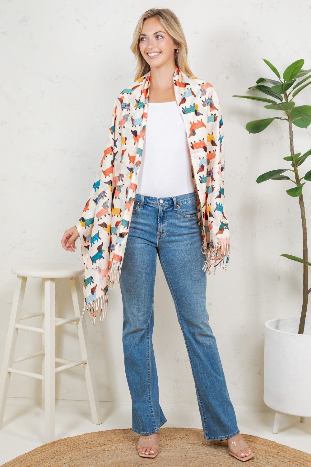 This playful dog print scarf is both stylish and functional. With its thick material, this scarf is sure to keep you warm while adding a fun and unique touch to your outfit. Perfect for any dog lover or fashionista looking to make a statement!