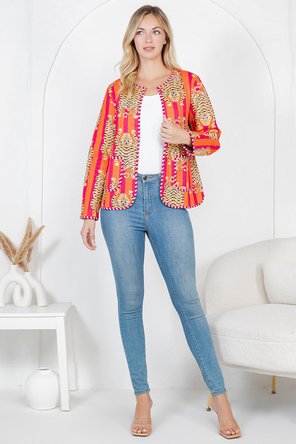 Stay cozy and stylish with this reversible Tiger Print Quilted Cotton Jacket in Orange. Soft and comfortable, it’s perfect for layering on cooler days. At 26 inches long, it offers just the right coverage while keeping your look trendy and fresh. Flip it inside out for two fun styles in one!