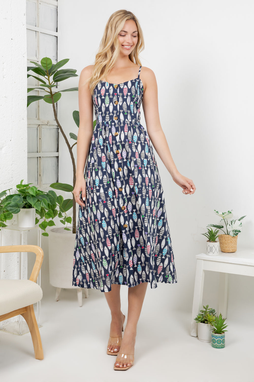 Dive into style with this whimsical sea of fish print cami dress. The playful aquatic design brings a sense of adventure to your everyday wardrobe, while the soft, breathable fabric keeps you cool and comfortable. Perfect for those who love ocean-inspired fashion with a touch of fun.